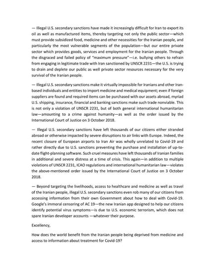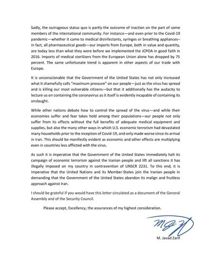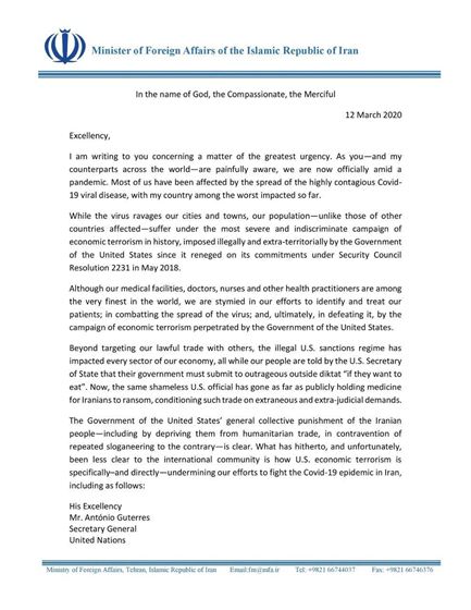, I urge the world body—and member states—to disregard inhuman US sanctions on my country. And insist that they be lifted. As the #COVID19 ravages Iran, we should recognize that viruses don't discriminate. To fight them, neither should humans.